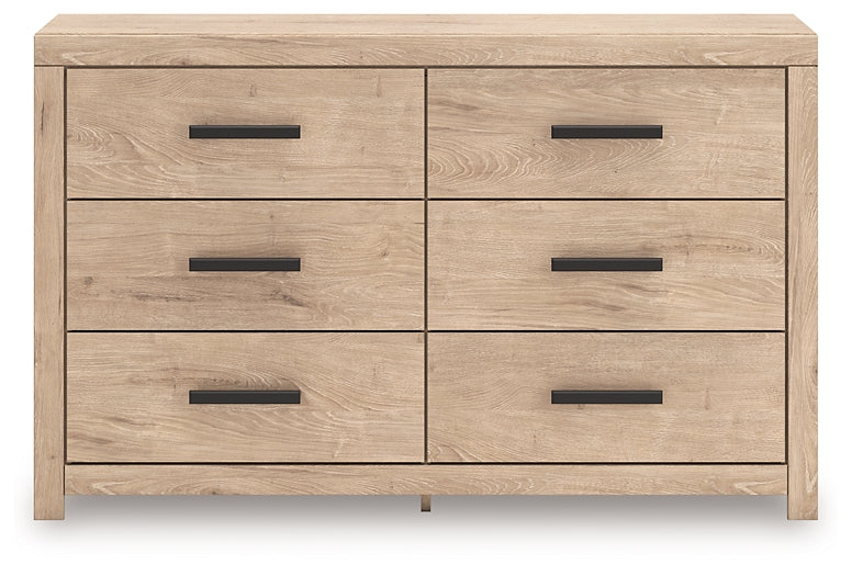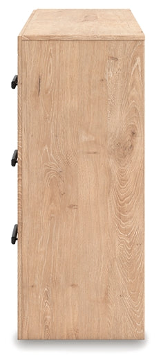 This dresser brings a touch of modern farmhouse charm to your home. Its light oak finish and clean lines have a fresh, airy feel, effortlessly creating an inviting atmosphere for a restful night’s sleep. Six spacious drawers with large black handles provide plenty of storage for all your nighttime essentials.